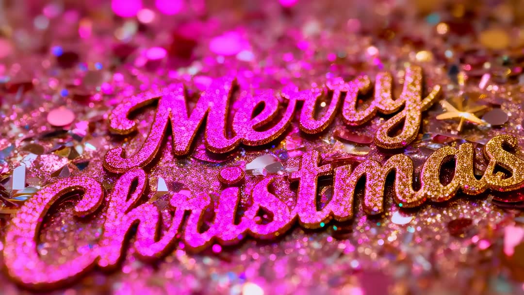 AI Generated Video. Video capturing close-up camera focus pull across glittering Merry Christmas cutout, revealing layered glitter texture, sequin bokeh, and metallic shimmer. Vibrant pink and magenta tones creating warm festive mood. Use for holiday social media clips, greeting card animated covers, website hero banners, product packaging mockups, festive TV commercials, event promos, craft tutorial intros. Pair with upbeat holiday music, overlay text, or slow-motion transitions for cinematic feel. Render options for looped background, GIF, or vertical formats for stories and reels.
