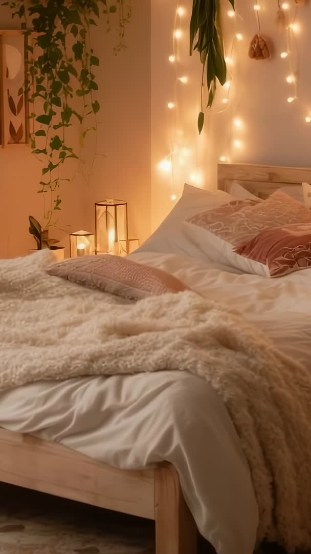 AI Generated Video. Vertical clip showing camera gliding from foot of bed toward headboard, revealing cream throw, layered bedding, velvet and textured pillows, glass lanterns with warm candle glow, and trailing hanging plants. Scene is creating cozy bohemian mood with soft string lights and neutral, warm color palette. Ideal for interior design promos, home decor social media reels, lifestyle brand storytelling, boutique hotel marketing, and sleep or wellness content. Clip is working well as b-roll for product showcase of throws, pillows, bedding, and rustic furniture, or as background for text overlay and voiceover. Recommend pairing with soft acoustic or ambient music, using slow motion or subtle color grading to enhance warm tones, and cropping for vertical platforms like TikTok, Instagram Reels, and Pinterest Story.