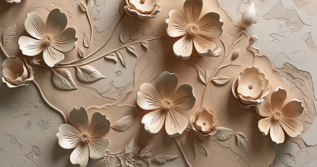 AI Generated Image. Video creatively showcases a wall featuring sculpted floral reliefs with expertly crafted, ornate designs. Opulent mix of texture and delicate artistry brings botanical motifs to life, creating a stunning decorative element for interior design. Movement highlights the dimensional and intricate details, making it suitable for concepts of artisanship, nature-inspired decor, or architectural showcases.