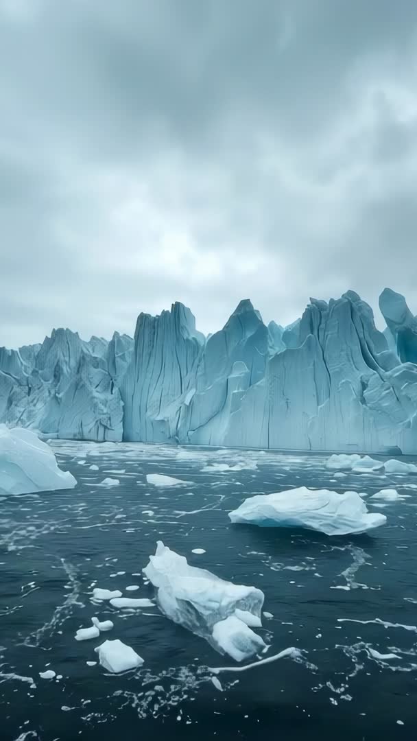 AI Generated Image. Vertical video showing camera moving along towering glacier front and bringing large ice floe into foreground over cold dark sea under overcast sky. Close-up of jagged blue ice cliffs and scattered bergs offering strong foreground interest and dramatic vertical composition. Capturing moody light and textured ice surfaces for immersive polar atmosphere. Suitable for documentary openers, climate and environment reporting, travel and adventure reels, social media vertical ads, website hero reels, broadcast lower-thirds, and educational content. Editing suggestions: using slow push-in or subtle parallax for cinematic effect, adding ambient wind and water sound for realism, color grading toward teal-cyan to enhance blue ice tones, leaving negative space at top for title or logo placement. Looping clip works well for background visuals and mobile-first storytelling.