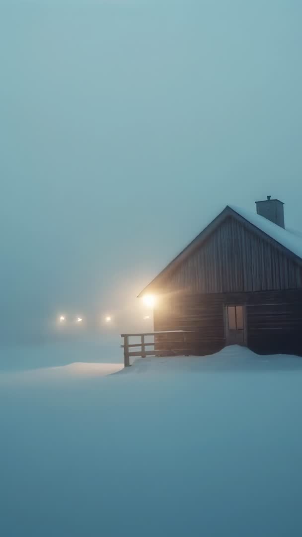 AI Generated Video. Vertical cinematic clip showing camera moving closer through dense fog while snow-covered ground guiding view toward wooden cabin with lit window and warm lantern glow. Fog lifting slowly, revealing porch railing and chimney, while cool blue tones contrasting with warm interior light. Slow, atmospheric pacing creating sense of solitude, calm, and mystery. Generous top-area copy space allowing text overlays, titles, logos, or product placement. Usage ideas: Working well for travel and tourism promos, lodge and retreat marketing, Instagram Reels and TikTok ads, seasonal blog headers, calming backgrounds for wellness apps, cinematic openers for short films and documentaries, greeting cards, and social media stories. Also fitting for title sequences, mood boards, hero banners, and atmospheric interstitials. Technical notes: Offering vertical 9:16 format, slow push-in camera move, soft focus from fog, and balanced contrast between cool exterior tones and warm interior light.