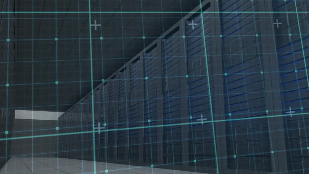 Camera Moving Forward and Upward, Cyan Grid Scanning Server Racks for Datacenter Calibration Video