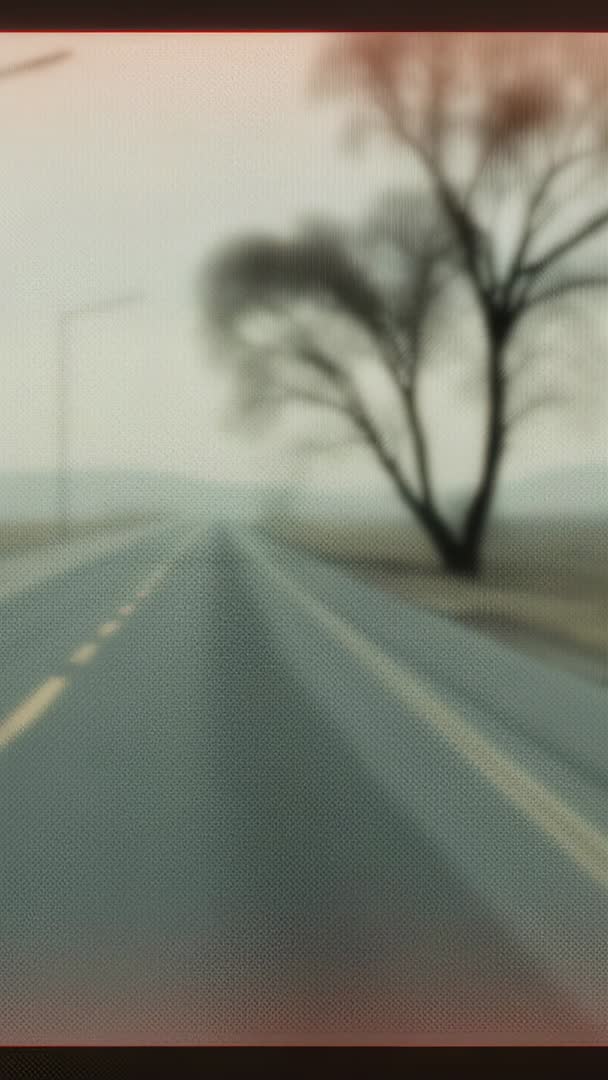 AI Generated Image. Vertical footage showing camera moving forward on foggy two-lane road, passing street lamps and leafless tree. Soft focus and motion blur creating dreamy, mysterious atmosphere. Mood conveying solitude, calm, introspection, quiet. Suitable for mobile-first projects such as Instagram Reels, TikTok, Snapchat, vertical ads. Useful as cinematic opener, suspense trailer background, travel or road trip montage, meditation and mindfulness app ambient clip, road safety or automotive campaign B-roll, documentary transitional shot. Footage allowing text overlay on sky and road margins, enabling easy color grading and subtle looping for seamless background. Ideal for designers and editors seeking moody, atmospheric vertical clip for social media, advertising, film projects, editorial storytelling.