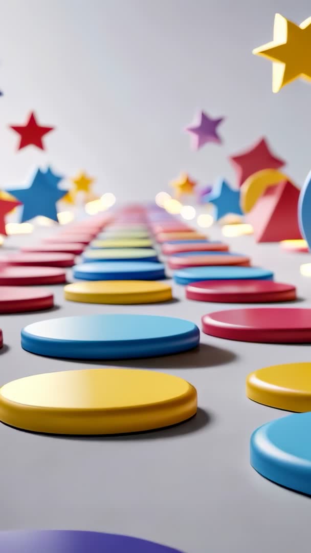 AI Generated Image. Video showing camera moving forward along rows of colorful circular disks on smooth gray surface while star shapes float in foreground and background. Shallow depth of field and soft studio lighting creating cinematic bokeh and strong sense of depth. Minimal geometric composition and vibrant color palette delivering playful futuristic mood. Working well for mobile-first projects including app splash screens, social media vertical ads, Instagram and TikTok stories, startup or tech branding intros, event openers, children's programming, celebration promos, product launch teasers. Clip working well as looping background, title sequence, hero banner, screensaver, or animated wallpaper. Allowing easy customization with color grading, speed adjustments, text overlay, logo reveal, and soundtrack pairing to match brand identity.
