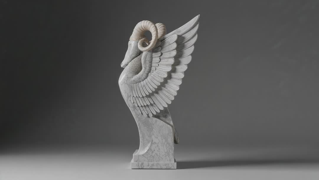 AI Generated Image. This video shows a camera smoothly orbiting an intricately carved marble sculpture, showcasing its elegant winged form and prominent horn features. The use of studio lighting enhances the sculpture's textures and details. Ideal for illustrating art history, mythology, or discussions about classical-art craftsmanship. Perfect for galleries, academic presentations, or creative marketing materials.