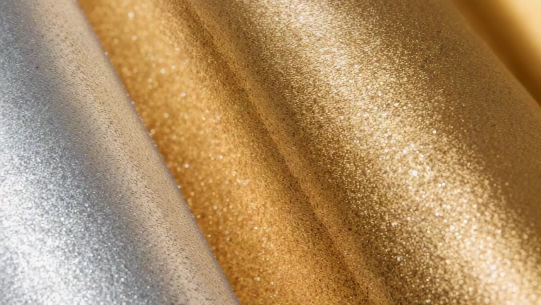 - Camera panning across glitter rolls revealing shimmering gold and silver metallic texture