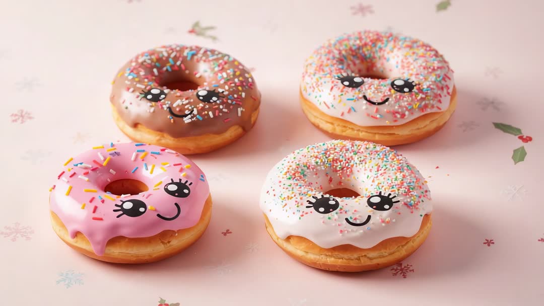 AI Generated Video. Footage showing camera gently panning around four pastel donuts with glossy icing, colorful rainbow sprinkles, and smiling kawaii faces on pale pink tabletop. Soft lighting creating playful, cheerful mood and bright, appetizing colors, while close-up angles highlighting glaze texture, fluffy dough, and sprinkle details. Scene working well as short loop or longer clip for social media reels, website hero banners, and digital ads. Suggested uses include bakery social media posts, dessert menu animations, product launch promos, children's party invitations, food blog intros, recipe video overlays, e-commerce banners, packaging mockups, in-store display loops, and branding or lifestyle campaigns aiming for whimsical, friendly tone.