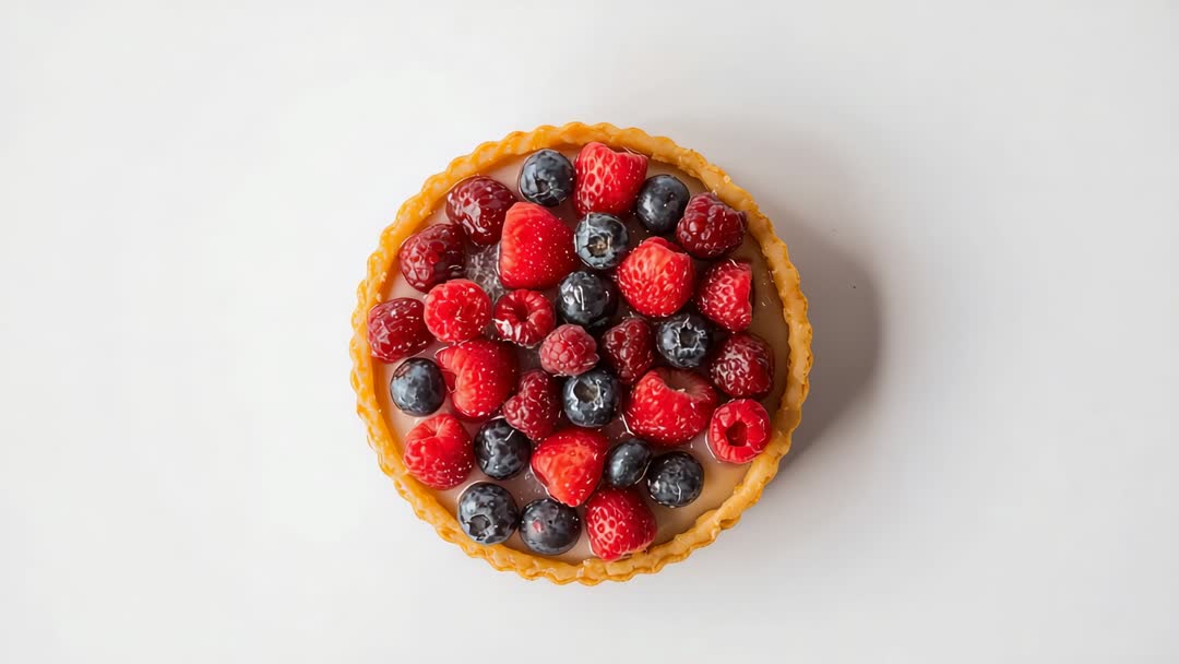 AI Generated Image. Clip showing slow overhead pan across mixed berry custard tart on white table, highlighting glossy glaze, fluted crust and vibrant strawberries, raspberries and blueberries. Camera movement creating calm reveal perfect for recipe introductions, food commercials, restaurant menu videos and social media reels. Footage working well as hero clip, close-up insert, loopable background for cooking tutorial or thumbnail still for recipe blog. Editors being advised to add soft music, natural kitchen sound or voiceover and to crop for vertical format for Instagram Reels and TikTok. Color palette combining white background, golden crust and saturated berry tones allowing easy text overlay and brand placement. Clip providing high-resolution footage for commercial licensing, advertising, packaging and culinary content.
