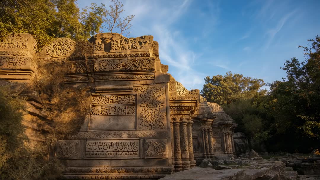 AI Generated Image. Footage showing sunlit ancient carved stone facade with fluted columns and intricate reliefs during golden hour. Camera panning slowly across colonnade, revealing weathered stone texture, ornate bas-relief panels, and overgrown vegetation framing architecture. Serving travel documentaries, heritage promotions, architecture presentations, museum exhibition loops, website hero backgrounds, and social media promos. Being ideal for historical narration, archaeological storytelling, cultural tourism campaigns, and educational modules on stone carving and restoration. Visual mood conveying timelessness, warm amber light, tactile surfaces, and nature reclaiming ruins. Editing suggestions: applying warm amber color grade, using slow cross-dissolve transitions, adding ambient field recordings for immersive soundscape. Deliverables: compatible with 4K timelines, supporting slow motion and close-up crop-ins for detailed insert shots.