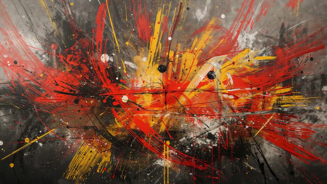 AI Generated Image. Video showing camera panning across textured abstract canvas featuring explosive red and yellow strokes, bold black accents, and layered splatter. Composition highlighting centered focal point with dynamic radial energy and expressive brushwork. Palette combining warm reds and yellows with muted gray and black for strong contrast and visual impact. Surface displaying thick impasto, dripping paint, and scattered droplets for raw tactile feel. Clip fitting art gallery promo, creative agency reel, music video background, modern interior projection, visual identity for brands, social media posts, website hero banner, album cover animation, and editorial about contemporary painting. Shot working well as short loop, slow reveal, or background overlay. Color grading and cropping options suiting wide-screen or vertical formats. Clip offering commercial and editorial licensing and useful for designers, filmmakers, curators, and marketers seeking bold, energetic backdrop.