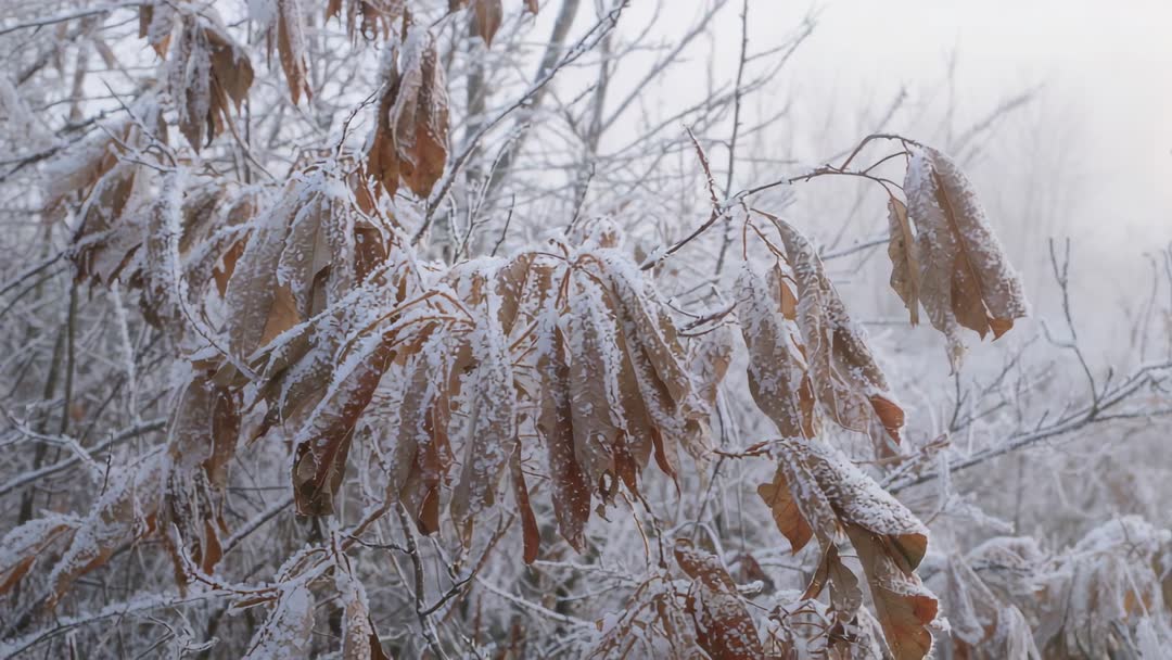 AI Generated Video. Slow camera pull back capturing frost-coated dried leaves drooping from slender branches at wood edge in soft morning fog. Close-up framing highlighting hoarfrost texture, muted brown foliage, and tangled branch silhouettes against pale mist. Mood conveying calm, cold, quiet, and seasonal transition from autumn to winter. Useful for B-roll in nature documentaries, winter commercials, environmental storytelling, weather forecast segments, and social media reels. Working well as website hero background, blog header, editorial illustration for seasonal content, or atmospheric stock footage for film and television. Color palette offering cool grays and warm browns for easy color grading and overlay text placement.