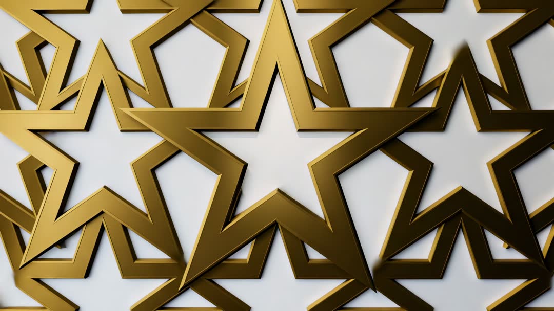 AI Generated Image. Video showing camera pulling back revealing interconnected gold star tessellation spanning off-white panel. Metallic stars casting soft shadows, producing deep three-dimensional effect and strong sense of repetition and symmetry. Composition highlighting geometric rhythm and seamless tiling, offering elegant modern motif for motion design. Suggested uses including luxury branding openers, awards show intros, product packaging reveals, website hero animations, event invitation animations, broadcast graphics and social media ads. File working well for looping backgrounds, title slates, texture overlays, set design mockups and interior decor concept presentations.