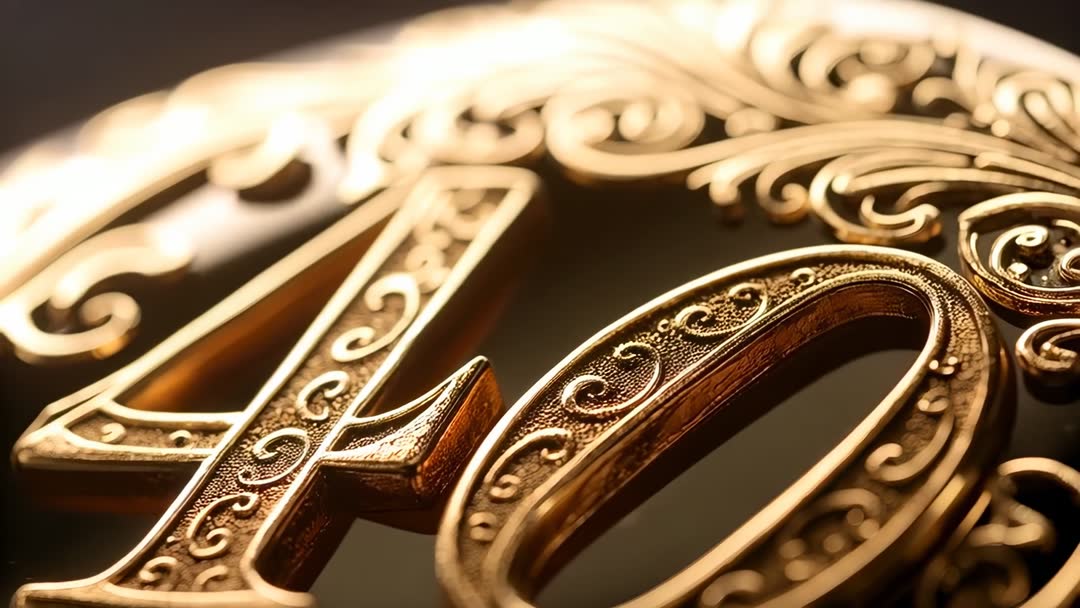 AI Generated Video. Clip showing camera pulling back while revealing ornate gold '40' medallion with detailed filigree and embossed engraving. Warm studio lights casting highlights and soft shadows, highlighting metallic texture and raised scrollwork. Macro framing creating shallow depth of field and creamy bokeh, focusing attention on numerals and surface detail. Suitable for anniversary and milestone content, luxury branding, jewelry promotion, countdown sequences, title openers, and event highlight reels. Useful for background layer in lower thirds, social media teasers, website hero banners, or broadcast graphics. Editable color grading and slow motion playback recommended to enhance shimmer and elegant motion. Duration and framing allowing seamless loop or transition into wider product reveal.