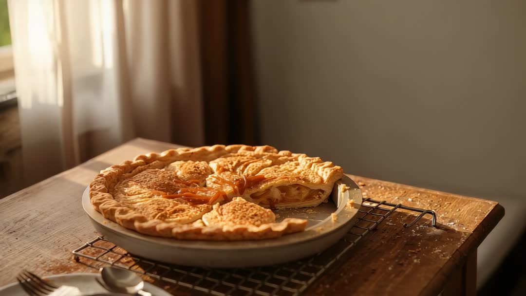 AI Generated Image. Video showing camera pulling back to reveal sunlit rustic apple pie being sliced on wooden table by window. Warm morning light streaming through sheer curtains, highlighting flaky crust and glossy apple filling. Close-up panning across ceramic pie dish resting on cooling rack with crumbs scattered on wooden surface, creating cozy homemade atmosphere. Composition featuring negative space on right for text overlay, allowing headline or recipe title placement. Working well for recipe videos, baking blogs, bakery branding, seasonal autumn campaigns, cafe menus, social media reels, and product packaging. Styling suggestions: pairing with warm color palette, adding vintage props, slowing frame rate for cinematic feeling. Technical notes: shallow depth of field, soft natural lighting, golden hour tones, rich texture emphasis.