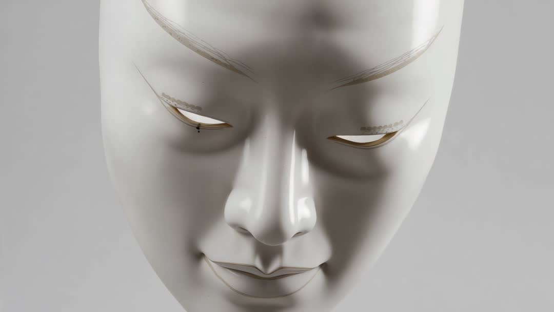 - Camera pulling back revealing white Noh mask with gold rims and glossy porcelain close-up