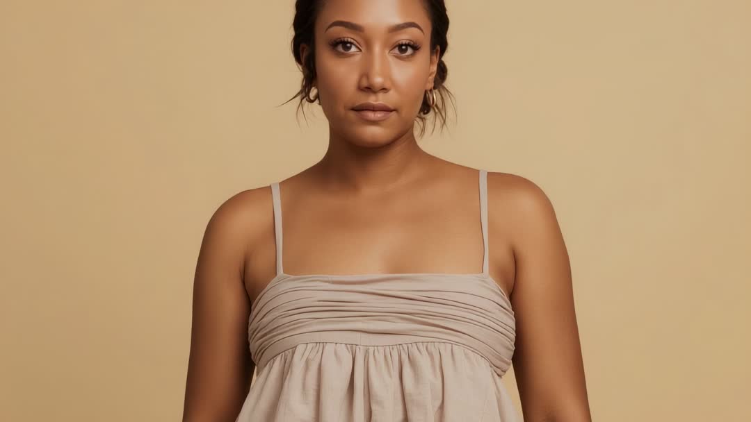 AI Generated Video. Camera pulling back, revealing model holding steady pose against warm neutral backdrop. Close-up head and shoulders framing highlighting ruched beige top, natural makeup, hoop earrings, smooth skin texture. Soft warm lighting creating golden tones and minimal aesthetic, providing calm confident mood. Use for beauty campaign hero, skincare landing page, fashion lookbook, model casting reel, online portfolio, social media profile, editorial spread, advertising banner, wellness branding, makeup tutorial thumbnail. Motion-friendly clip offering cinematic reveal and cutaway options for video edits, suitable for B-roll, transitions, title overlays and marketing visuals with ample negative space for text.