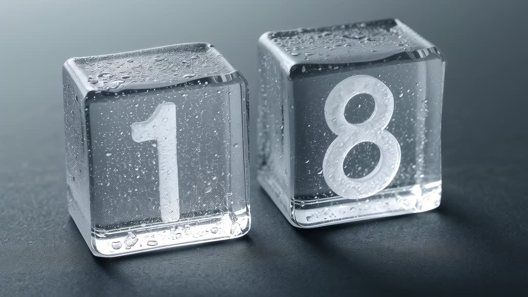 AI Generated Image. Video showing close-up of two glass cubes marked 1 and 8, surfaces covered in condensation and water droplets. Camera pushing focus across cubes, producing shallow depth of field and soft bokeh behind subjects. Studio lighting highlighting droplet texture and edge reflections while wet surface casting subtle shadow and reflection. Frame originating from 3D render or CGI, featuring photoreal glass and water physics for cinematic detail. Composition leaving ample negative space for overlaying text, logos, or countdown graphics. Suits 18th birthday promotions, age verification campaigns, beverage advertising, lifestyle branding, product demo clips, web hero banners, social media loops, and editorial features. Usage tips: place text or logo on left side, color grade toward cool tones for crisp modern look, slow down clip for dramatic reveal, loop for background motion in promotional displays.