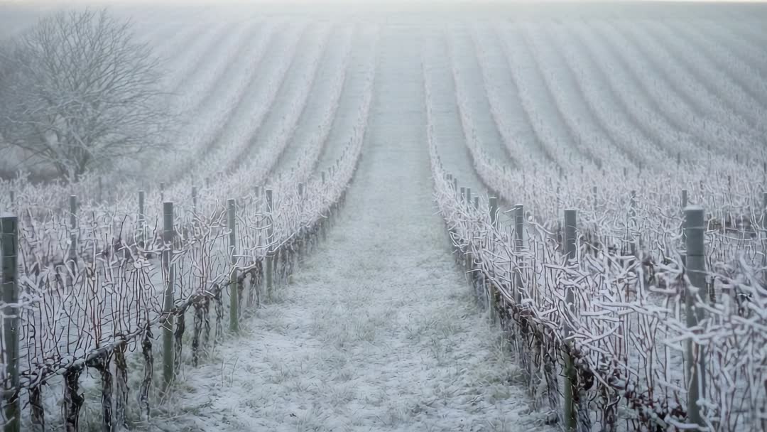 - Camera pushing forward through frosty vineyard rows revealing pruned vines, trellis posts