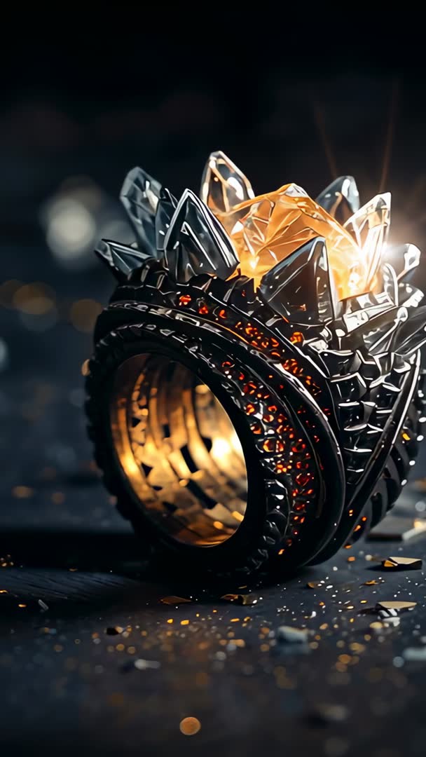 AI Generated Video. Showcasing ornate crown-style ring with glowing amber gemstone and intricate metalwork. Camera pushing in with shallow depth of field, warm golden reflections, and micro-bokeh for cinematic mood. Highlighting facets, texture, and internal glow for rich visual detail. Perfect for luxury brand vertical ads, social media product reels, and online store hero content. Useful for jewelry craftsmanship features, product demonstration clips, editorial promos, and high-end advertising campaigns. Ready for color grading, slow-motion edits, and sound design to amplify dramatic sparkle and premium feel.