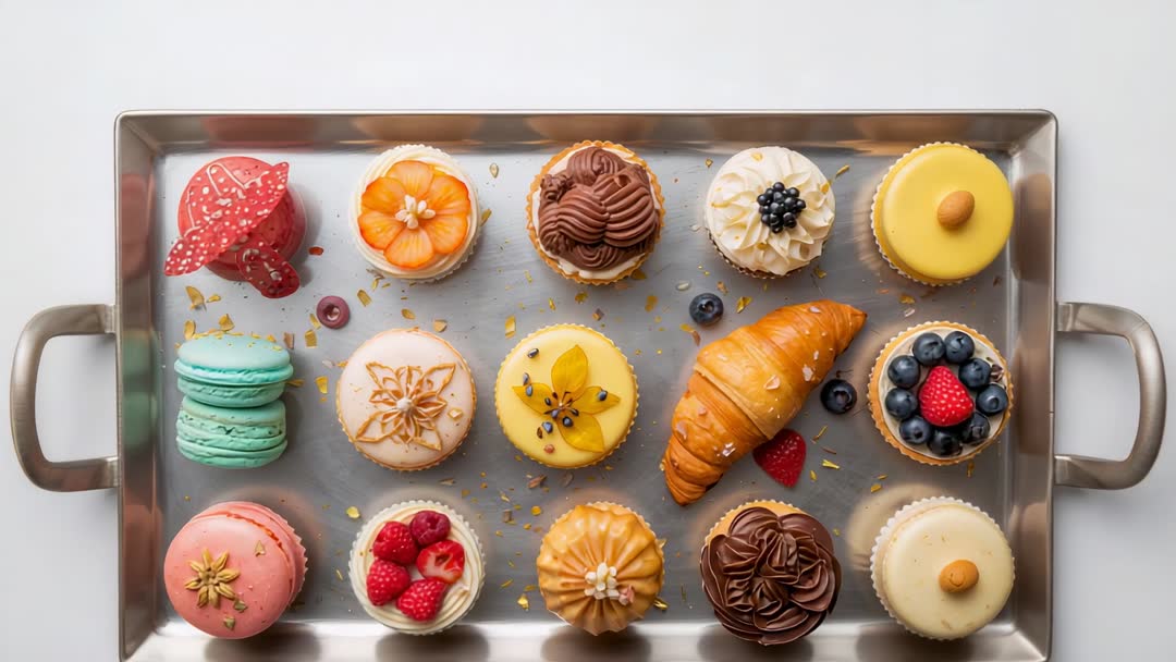 AI Generated Image. Video showing camera pushing-in to stainless tray on white tabletop, presenting assortment of pastries including croissant, macarons, cupcakes and tartlets topped with berries and chocolate. Overhead flatlay composition highlighting glossy pastry textures, gold flakes and scattered blueberries and raspberries. Studio lighting creating soft shadows and bright highlights, minimalist white background offering clean negative space for text or logos. Usage ideas: - Branding for bakery products, packaging, menus and cafe marketing - Promoting pastry collections on social media reels, Instagram feed and TikTok clips - Serving as hero footage for website banners, online menus and email headers - Enhancing recipe videos, cooking show openers and promotional commercials - Using as backdrop for food blogs, newsletters, catering brochures and print ads - Cropping to 16:9 for web video, 1:1 or 4:5 for social posts, 9:16 for vertical reels - Applying warm color grade, subtle vignette and gentle acoustic music for cozy mood - Looping short push-in for digital signage or in-store screens - Highlighting product details with close-up cuts, slow-motion frames and macro shots Technical notes: - Ideal for high-resolution delivery, color-correcting for warm tones - Suggested keywords and captions ready for e-commerce and stock licensing