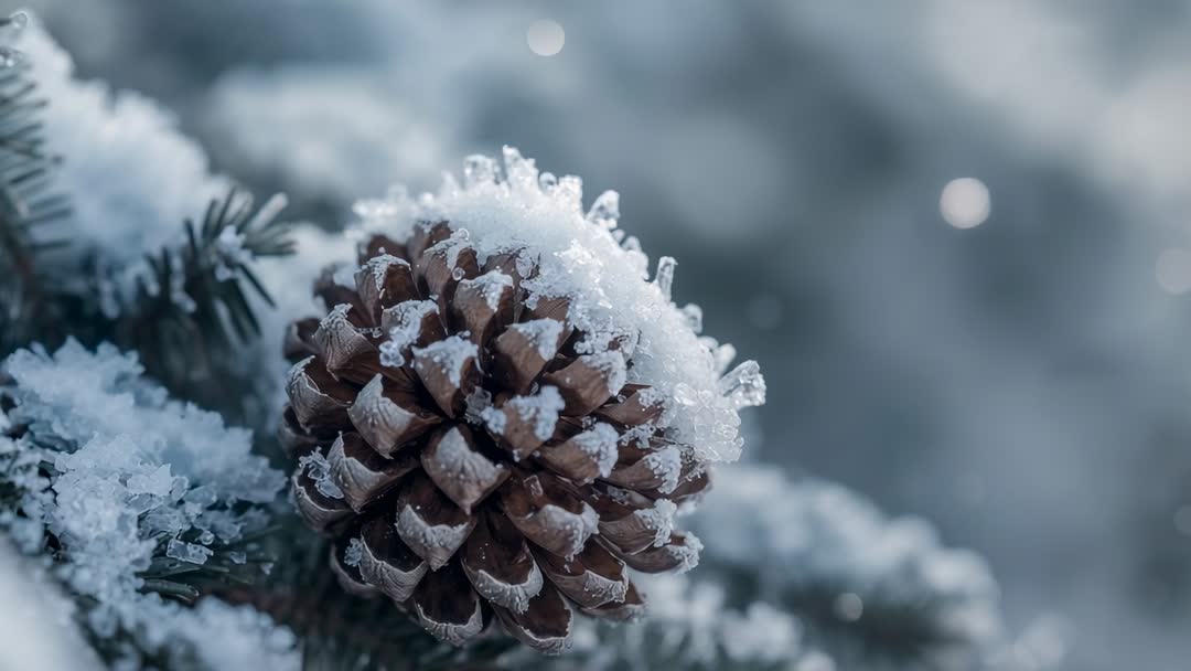 AI Generated Video. Slow camera rack focus revealing lace-like frost crystals collecting on brown pine cone nestling in deep green fir needles, with shallow depth of field and soft circular bokeh. Close-up slow-motion clip capturing tactile texture of cone scales and shimmering ice, evoking quiet winter morning and cold outdoor atmosphere. Working well for holiday campaigns, seasonal social media reels, website hero loops, nature documentary sequences, and background footage for meditation or wellness apps. Offering easy color grading toward cool blue tones, loop-friendly composition, and clear space for adding soft text overlays or subtle logo animation.
