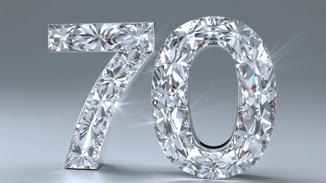 AI Generated Image. Camera moving across glossy gray floor, revealing large faceted diamond numeral 70, sparkling with prismatic highlights and crisp specular reflections. Lighting creating strong facet contrast, subtle lens flare accents, and soft mirrored reflections on floor. Shot featuring slow tracked reveal and slight rotation for dynamic cinematic feel. Serving as powerful opener for anniversary video content, milestone celebration promos, luxury brand idents, birthday greeting animations, or jewelry campaign ads. Providing ample negative space on right for overlay text, logo placement, or animated lower third. Working well with slow fade, glitter particle overlays, and elegant serif or modern sans type treatments. Deliverables compatible with 4K workflows and high-resolution renders; clip looping for seamless background use. Color grading suggestion: cool silver tones or warm gold tint for celebratory mood.
