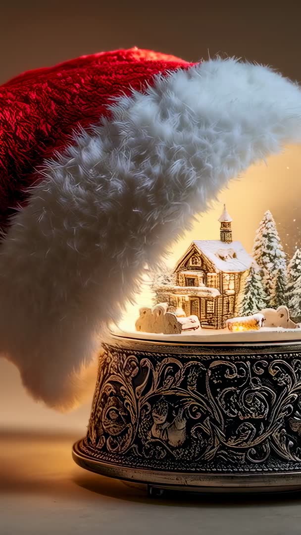 AI Generated Video. Vertical clip showing camera rising to reveal vintage snow globe tucked under large Santa hat. Globe containing lit cottage, snow-covered trees, and miniature figures glowing with warm golden light atop ornate carved metal base. Macro closeup capturing plush fur brim, intricate miniature details, and soft falling snow particles, creating cozy nostalgic mood. Usage ideas: Use for holiday commercials, social media reels and stories, seasonal product showcase, retail window displays, greeting card animations, website hero banners, background for text or logo overlays, cinematic intro for Christmas videos. Editing suggestions: Apply gentle slow zoom, warm color grade, soft vignette, and subtle particle animation to enhance magical feeling. Format ideal for vertical 9:16 projects, closeup crops, and split-screen layouts.