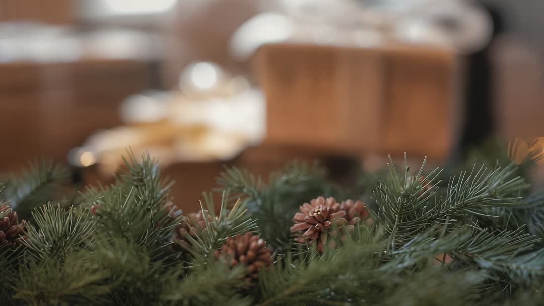 AI Generated Video. Showing camera moving and shifting focus from wrapped gifts in soft bokeh to evergreen garland with pinecones on mantel. Creating cinematic shallow depth of field and warm ambient lighting, producing cozy holiday mood. Emphasizing close-up evergreen texture and pinecone detail while background presents remain softly blurred. Suiting holiday marketing, gift guide videos, seasonal website hero clips, social media reels, store display loops, greeting card animations, and background footage for holiday commercials. Supporting overlay of text or logo on blurred gift area for promotional messaging. Recommending warm color grade and gentle vignette for enhanced cozy feel. Supplying easy-to-loop clip for ambient holiday scenes or product spotlight sequences.