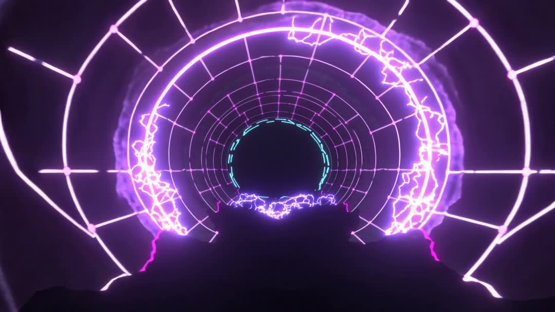 AI Generated Image. Video showing camera thrusting through neon tunnel of concentric rings, glowing grid lines, cyan fissures and purple electric arcs converging toward central void. Motion pulsing with rhythmic energy and fast-paced forward momentum. Lighting creating high-contrast neon silhouettes and deep shadow pockets for dramatic depth. Perfect for tech promos, sci-fi trailers, electronic music visuals, VJ sets, game intros, app splash screens, broadcast openers and social media reels. Working well looping for seamless background or serving as dynamic lead-in for title sequences. Suggestions for use: applying speed ramping, color grading to emphasize cyan and magenta tones, adding particle overlays and audio-reactive glow, combining with kinetic typography for cinematic openers. Deliverable fitting motion graphics projects, event visuals and immersive VR experiences.