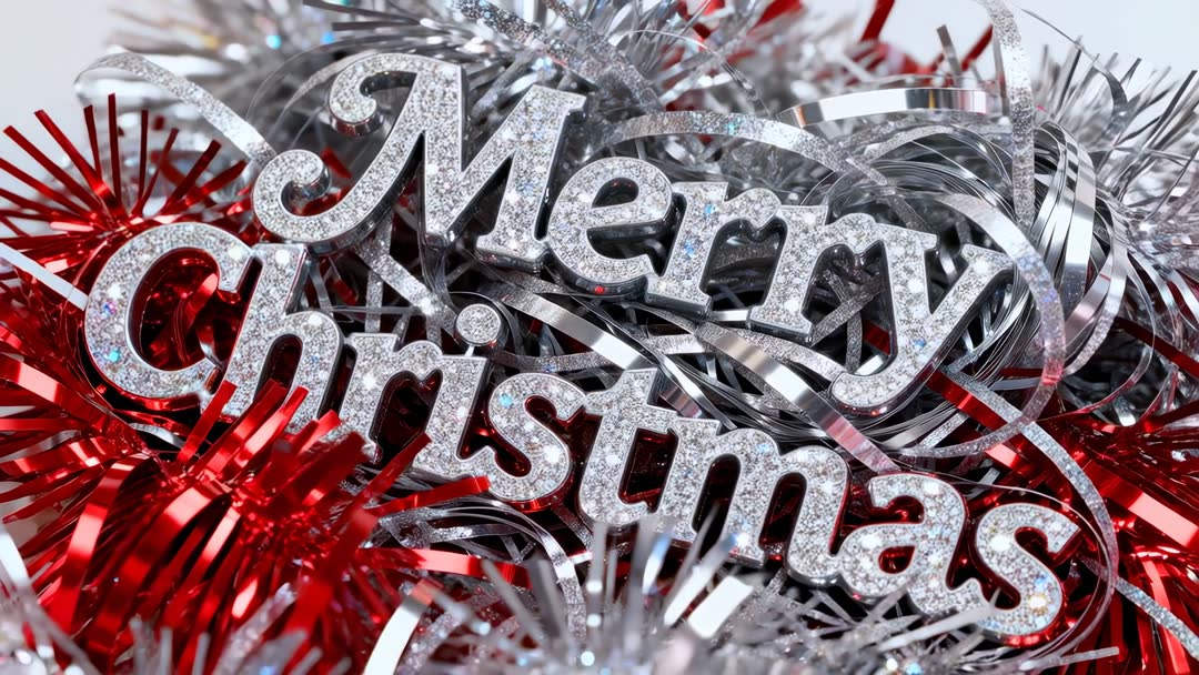 AI Generated Video. Short video clip showing camera zooming in on glittered Merry Christmas sign nestled in red and silver tinsel and ribbon on white tabletop. Sparkling letters catching light and reflecting highlights while thin metallic strands creating layered shimmer. Shallow depth of field producing soft bokeh and cinematic focus pull. Ideal for holiday greeting animations, social media intros, website hero banners, e-commerce product pages, seasonal advertising, retail signage, greeting card motion covers, TV commercial stings. Use as loopable clip for festive social posts, background for text overlays or countdowns, opener for holiday-themed videos, or accent element in marketing campaigns. Color palette featuring metallic silver, bright red, white; supports warm or cool color grading. Recommend cropping for landscape or square formats, adding gentle zoom and soft instrumental music for polished festive feel.
