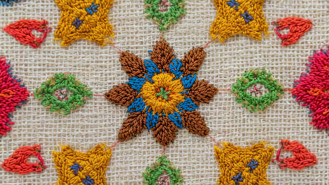 AI Generated Image. Video showing tight macro zoom into central embroidered star on beige woven fabric, highlighting vibrant thread colors, dense knot stitches, and coarse fabric texture. Camera slowly pulling back to reveal surrounding geometric motifs and repeating patterns, offering rhythmic composition and handcrafted detail. Ideal for craft tutorial video, textile design reel, artisanal product listing, cultural heritage promotion, pattern repeat demonstration, or background for slow motion transitions. Useful for blog headers, social media reels, online store banners, educational content on hand embroidery techniques, and mood-setting sequences in documentary clips. Color palette featuring ochre, cobalt blue, emerald green, coral red, and warm brown, enhancing craft-focused layouts and branding.
