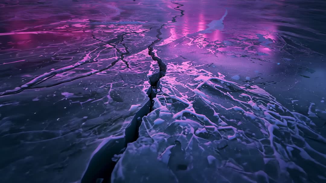 AI Generated Image. Video showing camera zooming into frozen ice fissure at dusk revealing intricate frost patterns, cracked ice plates, and scattered debris under pink-purple twilight glow. Footage offering close-up texture and dramatic lighting for use in environmental storytelling, climate science visuals, or winter-themed cinematic projects. Useful as background clip for website hero banners, social media reels, music video transitions, and documentary openers. Compatible with color grading for moody or neon-inspired palettes. Delivering slow cinematic motion for titles, overlays, and abstract art compositions. Suitable for editorial use in weather reports, science presentations, and atmospheric advertising for cold-weather gear or travel brands.