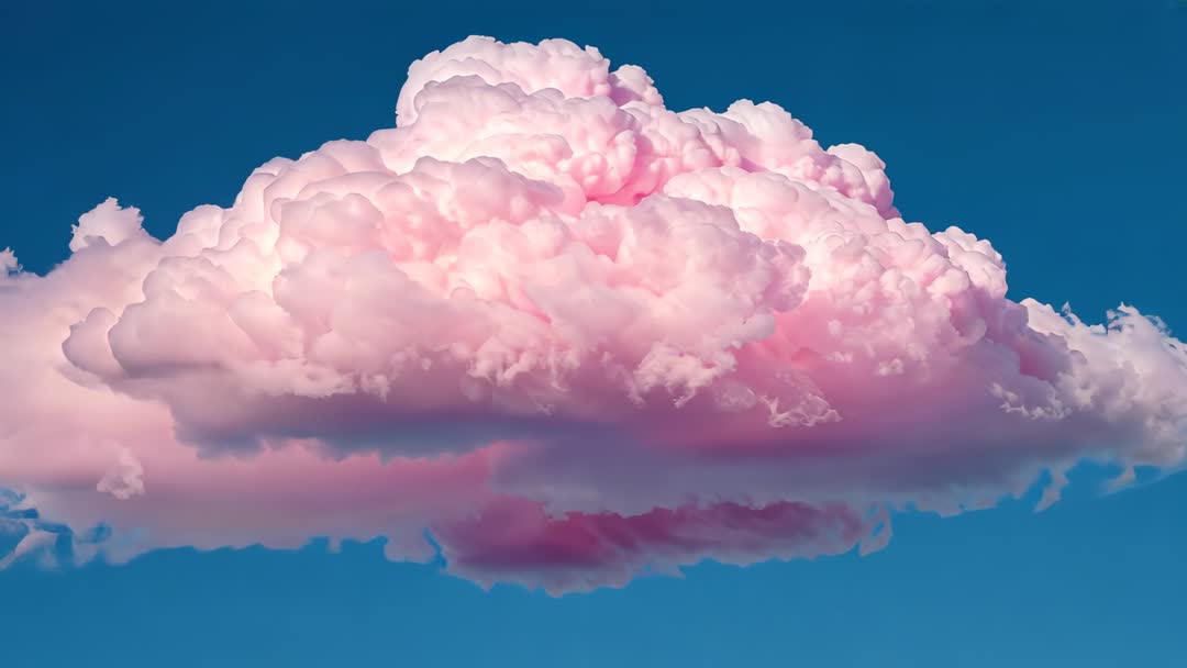AI Generated Image. Zooming in on rose-tinted cumulus cloud, revealing soft, sculpted folds and layered tonal shifts against deep blue sky. Clip providing serene, minimalist visual perfect for calming or dreamy themes. Suitable for website hero backgrounds, social media reels, meditation or wellness apps, advertising campaigns, weather segments, mood-setting videos, and editorial motion graphics. Working well with slow zoom out, parallax movement, gentle color grading, and overlay text. Available in high resolution for 4K and HD workflows. Useful for branding, seasonal campaigns, lifestyle projects, and creative stock libraries seeking ethereal or surreal sky visuals.