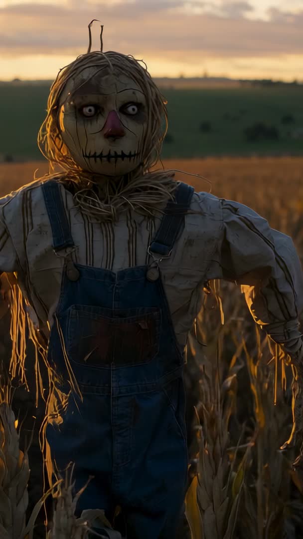 AI Generated Image. Camera zooming into scarecrow wearing striped shirt and denim overalls amid cornfield during golden hour. Scarecrow staring with pale button-like eyes and stitched mouth, straw hair catching rim light. Sunset casting warm backlight while tall stalks swaying in breeze, creating moody silhouette and long shadows. Atmosphere leaning eerie and nostalgic, mixing rural solitude with subtle menace. Suggested uses: Halloween promo, horror short, spooky trailer, seasonal social media reel, TikTok or Instagram vertical ad, fall festival poster, agricultural folklore story, cinematic b-roll for short film, background for podcast or audiobook cover. Editing suggestions: apply teal-orange grade or desaturate greens for moody look, add distant crow calls, wind ambience, low rumble bass for tension, use slow zoom or hold on eyes for jump scare. Consider adding subtle film grain and vignette for vintage rural feel. Delivery tips: provide vertical 9:16 aspect for mobile-first platforms, trim to 6-15 seconds for reels, leave space in upper third for title or overlay text, supply color-graded and raw versions for flexible post production.