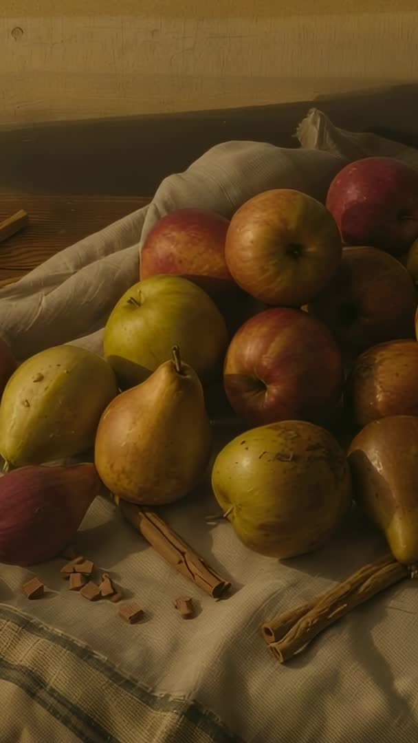 AI Generated Image. Vertical clip showing slow camera zoom into apples and pears arranged on linen with cinnamon sticks, emphasizing textured surfaces and warm, vintage tones. Soft directional light creating cozy, moody atmosphere and natural color palette. Useful for autumn and harvest content, recipe intros, food reels, farmers market promotions, organic produce branding, cafe and restaurant social posts, seasonal product ads, and lifestyle video backgrounds. Editing suggestions: use 6–12 second slow zoom loop, apply warm color grade and gentle film grain, add soft vignette and subtle motion blur for cinematic feel, overlay minimal text for title cards or ingredient lists. Framing tips: keep focal point slightly off-center for copy space, preserve vertical safe area for captions and logos. Licensing ideas: suitable for commercial use on social media, website hero reels, packaging, editorial features, and promotional banners.