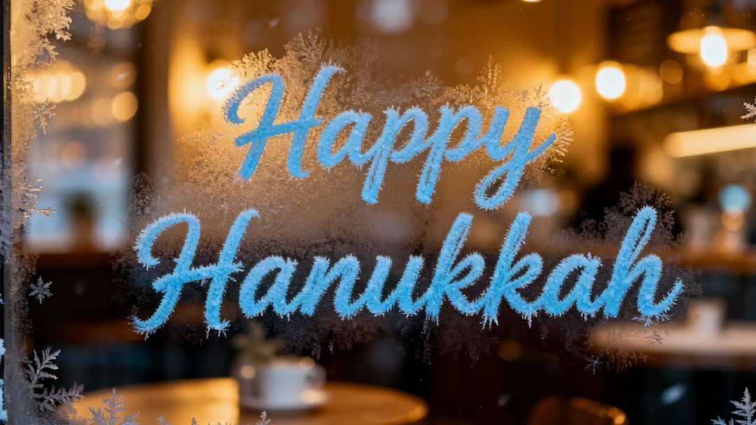 AI Generated Image. Clip starting with camera zooming on blue Happy Hanukkah calligraphy painted on frosted window at cozy cafe, warm bokeh lights glowing in background. Closeup highlighting delicate frost crystals, snowflake patterns, and textured brush strokes of lettering. Footage providing cozy winter holiday atmosphere for seasonal marketing, social media reels, storefront promotions, and greeting card animations. Clip working well as intro for Hanukkah event videos, restaurant holiday menu features, local business advertising, and festive website banners. Cinematic shallow depth of field and warm interior lighting supporting mood of comfort, celebration, and seasonal nostalgia.