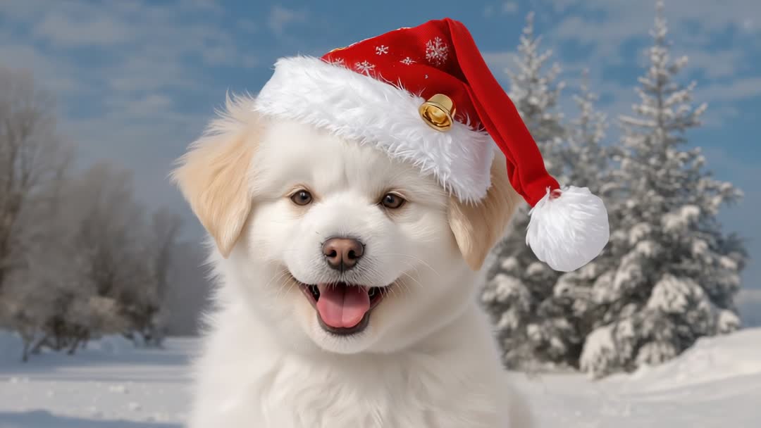 AI Generated Video. Video showing camera zooming on fluffy white puppy wearing red Santa hat with bell, snuggling in snow and panting with joyful expression. Background showing snow-covered trees and soft blue sky. Close-up framing capturing fluffy fur, bell detail, warm brown eyes and playful tongue. Motion holding suitable for short loop or slow reveal for greeting card intro. Great for creating holiday cards, designing social media reels, producing seasonal ads, promoting pet products, enhancing veterinary clinic posts, supporting animal shelter campaigns, decorating calendar spreads and blog headers. Suggested edits: add festive music, overlay holiday greeting text, apply soft vignette and warm color grade, create 5-10 second loop for Instagram reels and stories. Color palette working well with warm reds and cool blues. Licensing suitable for commercial and editorial seasonal use.