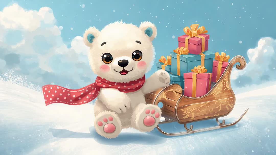 AI Generated Video. Scene showing playful polar bear cub wearing red polka-dot scarf sitting beside ornate wooden sleigh loaded with colorful gift boxes wrapped with gold ribbons on gently sloping snowy hill under soft falling snowflakes and clear blue winter sky. Camera zooming in as cub opens eyes, raises paw toward sleigh, conveying wonder and playful anticipation. Composition providing generous left-side negative space for text or logo overlay, motion working well for gentle pan, slow zoom, or parallax animations. Color palette featuring soft blues, warm pinks, creamy fur tones, and golden accents, creating cozy festive mood. Footage suiting holiday video intros, social media reels, seasonal ads, children's content, greeting animations, retail promos, packaging mockups, classroom storytelling, and festive website banners. Clip working well as short loop or extended cut, aligning with 4K and HD workflows and allowing easy color grading and captioning.