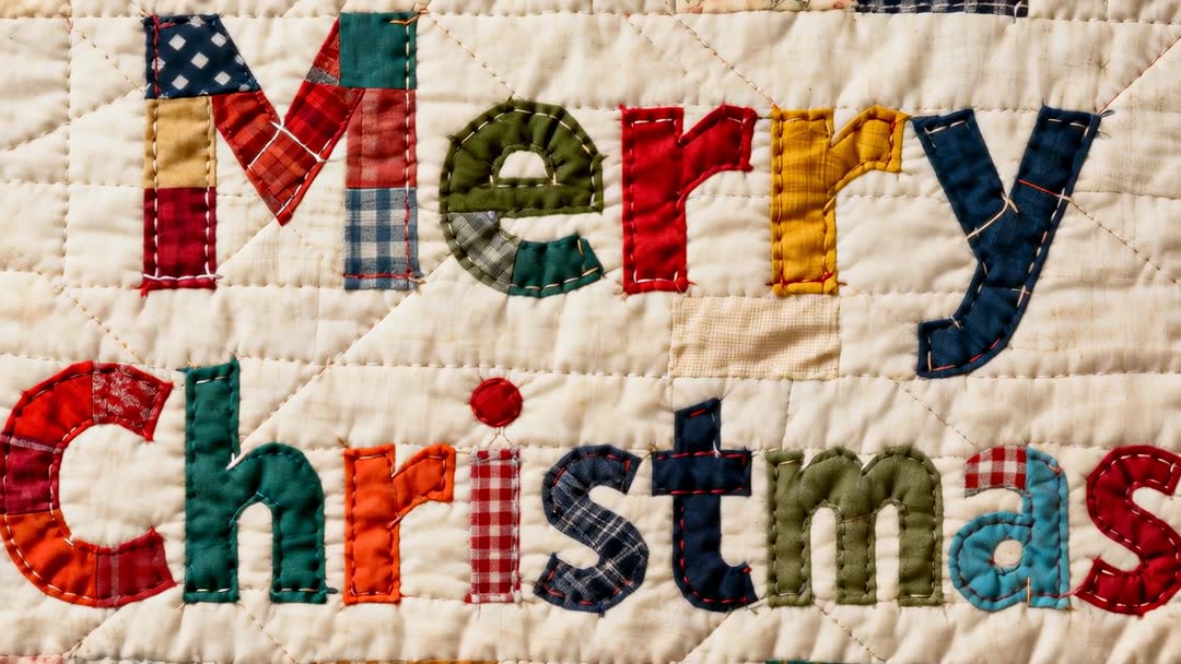 - Camera zooming revealing Merry Christmas patchwork quilt with colorful stitched applique letters
