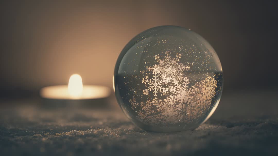 - Candlelight revealing snowflake patterns inside crystal orb on snowy tabletop