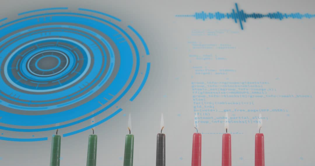 Candles are lighting sequentially beneath a display of blue digital holograms and floating computer codes, creating a blend of traditional warmth and high-tech ambiance. The unique fusion of computer code and igniting candles suggests innovation merging with ritual. This videory could be used for technology presentations, coding workshops, or campaigns or promotions intended to inspire both digital advancement and celebratory initiatives.