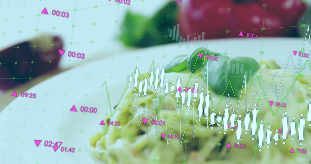 Candlestick Chart Overlaid on Focused Pasta Dish Video