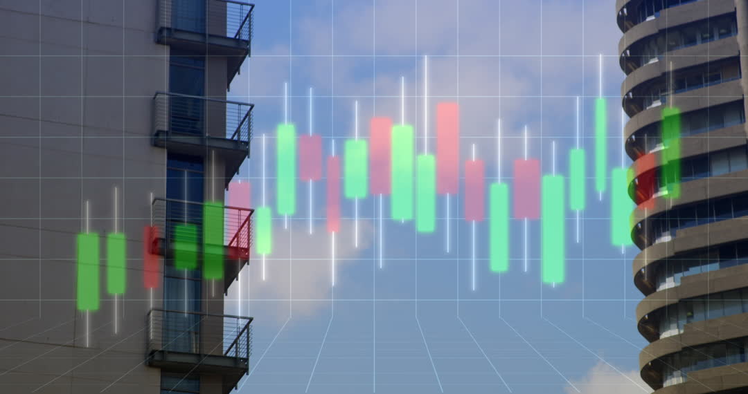 Visualization symbolizes intersection of finance and architecture, highlighting market data superimposed on urban skyline. Useful for illustrating concepts in technology-infused finance, real estate analytics, economic analysis, business presentations, or educational materials discussing investment potentials in urban development.