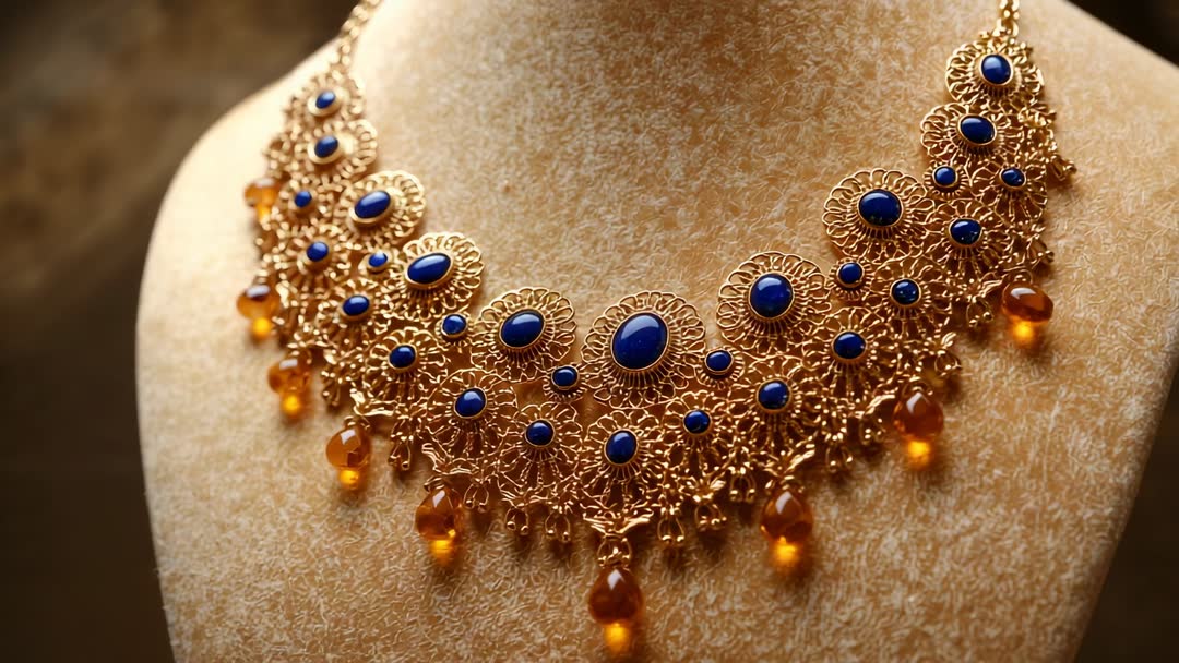AI Generated Video. The video captures a beautiful gold filigree necklace adorned with striking blue stones and hanging amber beads, shown on a display bust in close-up. Reflecting exceptional craftsmanship, it exudes luxury and elegance. This kind of video is ideal for showcasing high-end jewelry in advertisements, marketing campaigns or as decorative visual content in luxury brand presentations.
