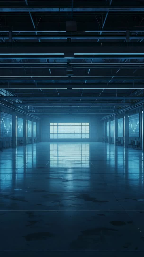 AI Generated Image. Showing expansive empty warehouse interior bathed in cool blue light, reflective floor creating strong mirror reflections and long vanishing lines. Providing clean, modern backdrop for product reveal, automotive launch, fashion editorial, tech promo, or cinematic opener. Working well as vertical video for social media reels, mobile ads, and app backgrounds. Allowing easy overlay of motion graphics, titles, or brand elements on illuminated panels. Using slow push-in movements, crane or drone shots, and subtle camera shake to enhance atmosphere. Serving as loopable clip for websites, corporate presentations, and broadcast bumpers. Allowing simple color grading and sound design to shift mood from moody to futuristic.
