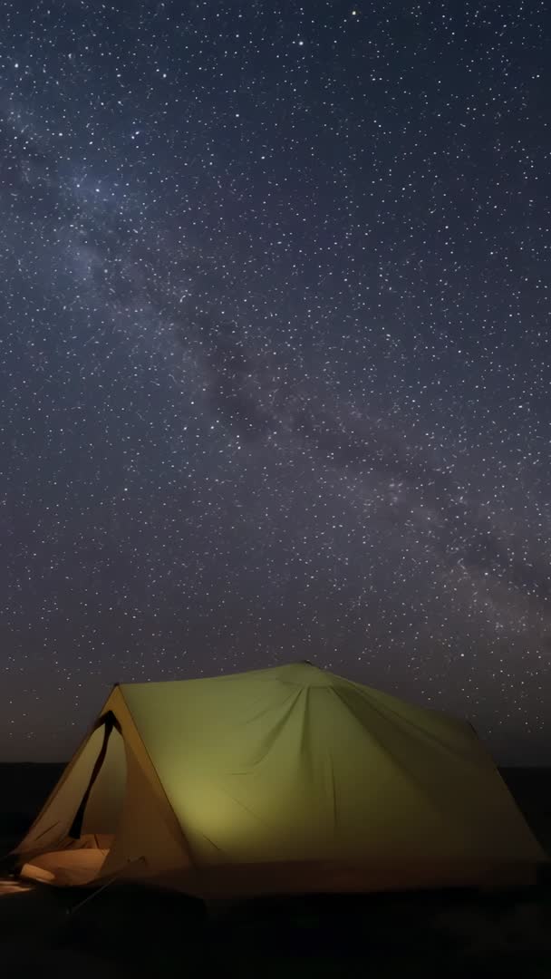 AI Generated Image. Vertical video starting with yellow-green tent glowing on plain under Milky Way, then panning upward to reveal dense star field and galactic band. Camera capturing warm lantern light filtering through tent fabric, creating cozy contrast with cold night sky. Composition emphasizing vastness of galaxy above tiny human shelter, evoking solitude, wonder, and outdoor adventure. Footage working well for travel and tourism promos, camping gear advertising, astrophotography tutorials, social media reels, calming background for meditation or sleep apps, outdoor lifestyle vlogs, and website hero sections. Use slow crossfade and ambient soundtrack to enhance cinematic mood. Color grading recommendations: boost deep blues and subtle greens while preserving star detail. Suitable for vertical-first platforms and mobile storytelling.