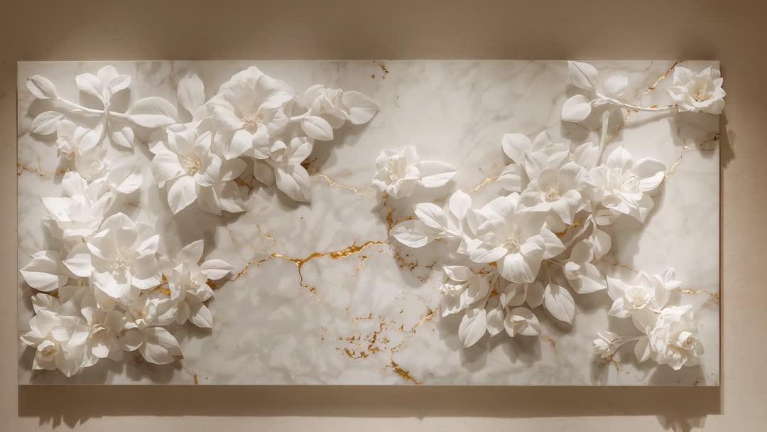 AI Generated Image. Light transitions elegantly over an artistic wall relief in a gallery, featuring intricate white flowers and delicate gold veining. This presents a quiet synthesis of shadow and illumination, accentuating the harmony between nature and opulence. Relevant for setting creative mood in luxury decor magazines, artistic appreciations, or enriching internet and print banner spaces focusing on refinement and grand entrance design.