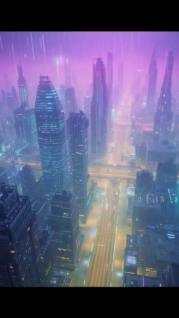 - Capturing Neon Rainfall Over Futuristic Metropolis Vertical Aerial Skyline