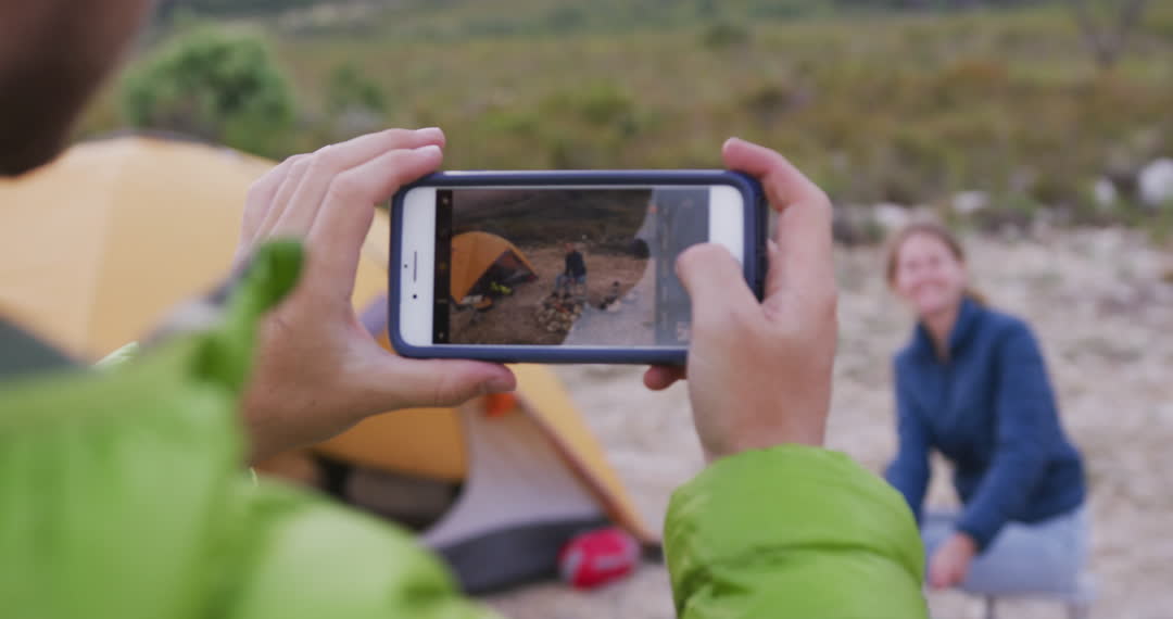 Hands holding smartphone taking photo of woman sitting by campfire cooking sausages with tent nearby. Perfect for themes of outdoor adventure, travel, camping experiences, or digital detox. Suited for articles or promotions about nature exploration, hiking trips, and technology in outdoor settings.