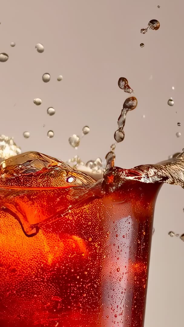 AI Generated Video. Showing vertical close-up of carbonated amber liquid producing crown splash as ice collides with glass, sending droplets and spray upward. Featuring vertical orientation, slow-motion capture, high-frame-rate, studio lighting, crisp surface detail, visible condensation and effervescence. Delivering dramatic motion and rich amber tones, creating strong visual impact for beverage branding and product launch. Working well for beverage commercials, cocktail promotions, soft drink ads, packaging animation, menu backgrounds, website hero clips, mobile reels, and social media stories. Supporting edits with text overlay in upper negative space, adding logo reveal or price callouts, or pairing with upbeat music for short-form advertising. Providing loopable action for motion graphics, transition clips for editing, and close-up reference for food styling or photography tutorials. Recommended export for vertical platforms, 9:16 aspect ratio, slow-motion playback for emphasizing droplets and fizz.